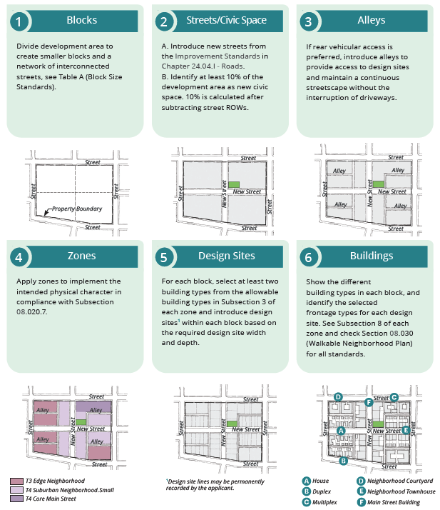 The Objective Design and Development Standards is also an exemplary model of multi-jurisdictional cooperation. By pooling their financial resources, Marin County communities have created a shared form-based coding platform that aligns regulatory language across the county and provides more accessible, fair, and transparent ways for guiding development. The toolkit provides a menu of calibrated standards (especially helpful for communities with limited institutional capacity) with options for further customization through place-based approaches. For example, Chapter 8 of the code—Specific to Large Sites—masterfully describes how to create walkable neighborhoods through calibration of basic urban design elements such as blocks, streets, and buildings for various site scales and contexts.