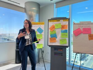 As the convening shifted to the second half of the day, the attendees split into smaller groups for brainstorming activities. Beth Osborne, Vice President of Transportation and Thriving Communities at SGA, led a visioning activity in which groups identified the current issues facing the Complete Streets movement, emerging trends, and some that are fading away. The groups wrote their ideas on post-it notes and were asked to add more throughout the convening.