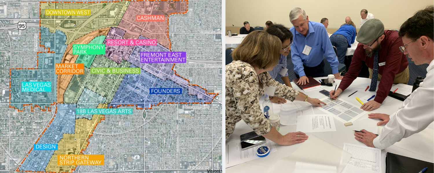 Left: Las Vegas, NV hosted a series of FBCI courses in 2017 and 2018 to get planning staff, developers, and other stakeholders up to speed on their new form-based code covering downtown’s 12 districts. (Image: VisionLV) Right: An FBCI course in Punta Gorda, FL shows participants the placemaking potential of form-based codes by using building form and public space standards within a regulating plan. (Staff photo)
