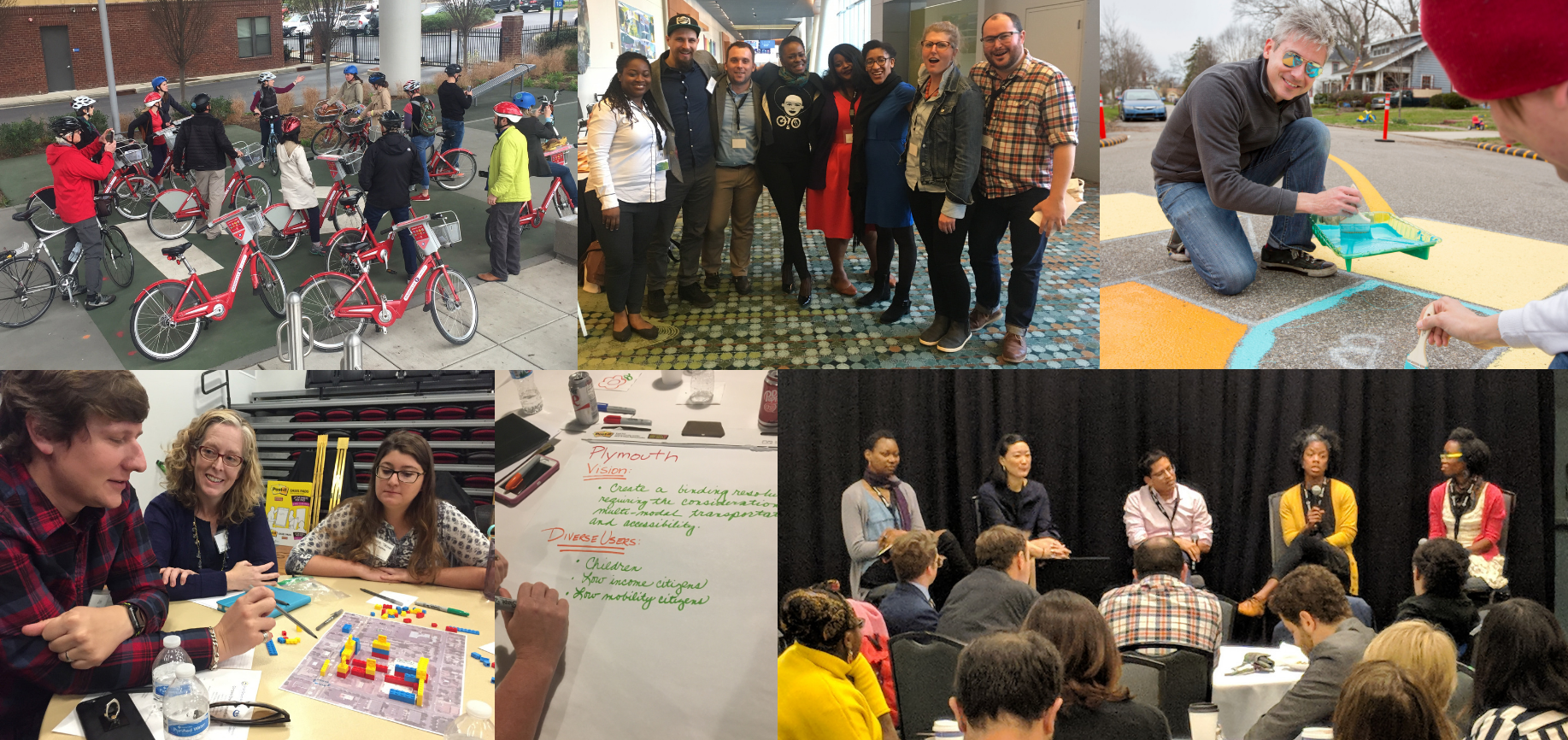 Top: photos from Intersections: Creating Culturally Complete Streets Bottom, left to right: Participants in the Colorado Consortium Series conduct an exercise about land use; Workshop notes from the Michiana Area Council of Governments; Residents of South Bend, IN paint a traffic circle as part of the Safe Streets Academy.