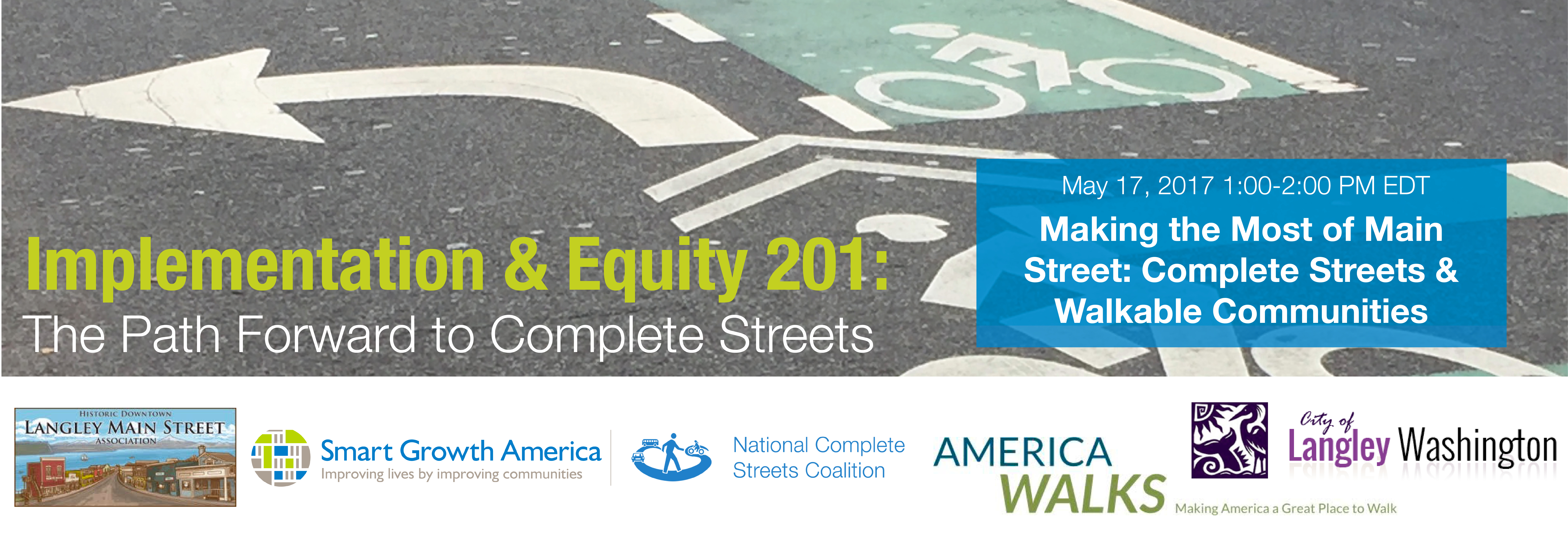 Webinar next week: Making the Most of Main Street — Join the National Complete Streets Coalition Wednesday, May 17, 2017 from 1:00-2:00 PM EDT for our webinar “Making the Most of Main Street: Complete Streets & Walkable Communities.” Co-host America Walks and speakers from Langley, WA will join the Coalition to discuss how a Complete Streets approach can help communities revitalize downtowns. Participants will learn about developing and implementing Complete Streets, the intersection of public health and rural economic development, how to get community members involved, and finding funding.