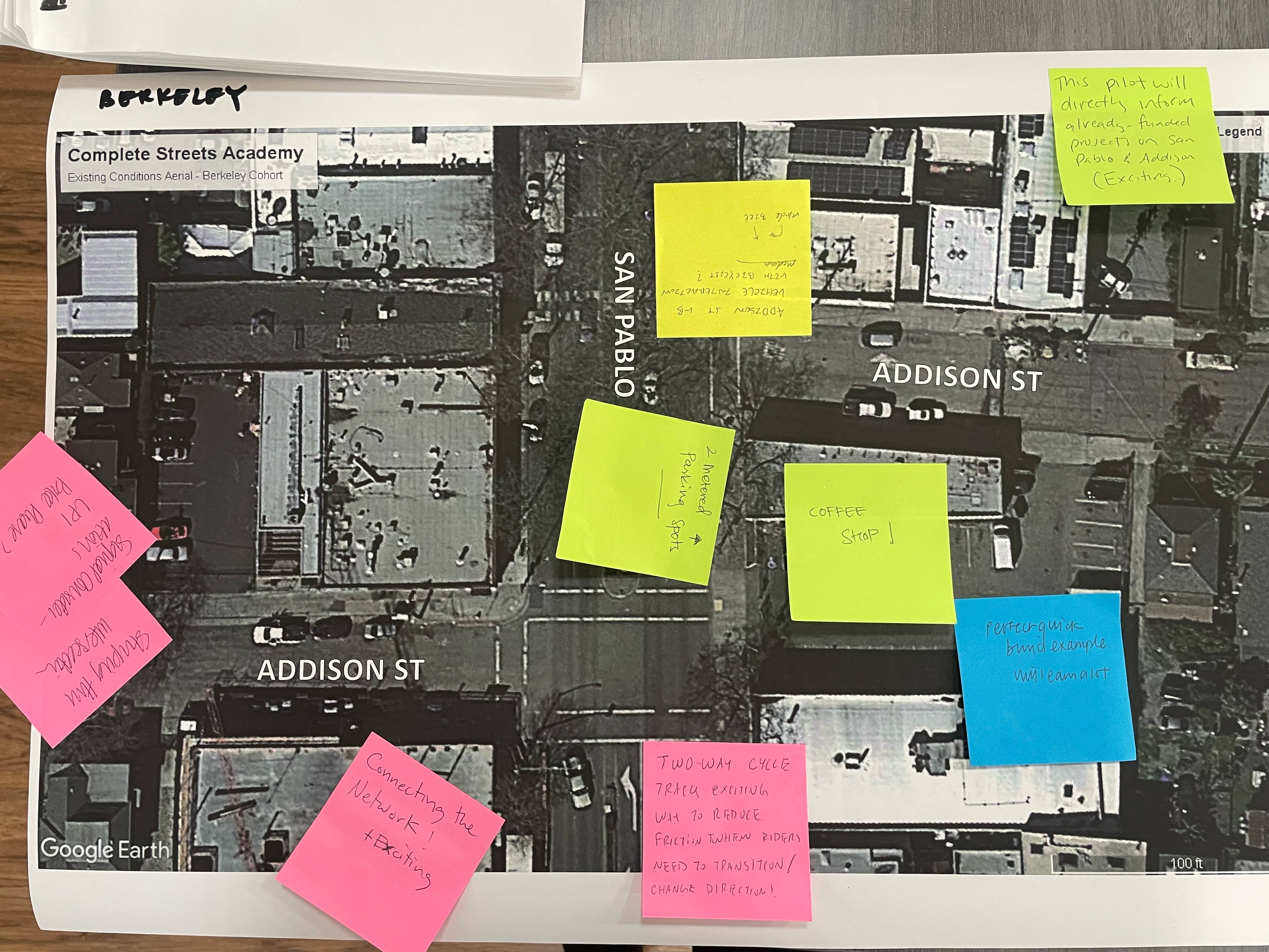 Though Berkeley was ultimately unable to see their quick-build demonstration come to fruition, plans are in the works for the corridor informed by their Complete Streets Leadership Academy experience. In November 2023, the Berkeley City Council considered and approved two conceptual designs for the Alameda County Transportation Commission (ATC) to explore with CalTrans: their preferred option of a one-way cycle track on each side of the street and a fallback option that includes a two-way cycle track on the east side. Whichever design is chosen, the ATC will be constructing the project simultaneously with other Safety Enhancement Projects on San Pablo Avenue, expected in the spring of 2025.