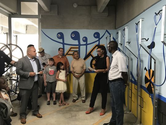 VELO also helped connect a local artist in Bloomfield to paint a mural at the town’s bike depot in collaboration with Bloomfield Parking Authority and the New Jersey Bike Walk Coalition. Papa Tall, the artist, moved to the United States from Senegal two decades ago and turned the depot’s previously blank walls into a message representing “love and family on the road.” Anyone who lives in Bloomfield can sign up for a membership with the bike depot which provides secure, covered bike storage.