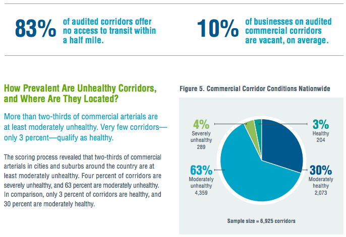 - Unhealthy corridors are ubiquitous. 67 percent of commercial corridors are at least moderately unhealthy, and 4 percent are severely unhealthy. Only 3 percent can be considered healthy.