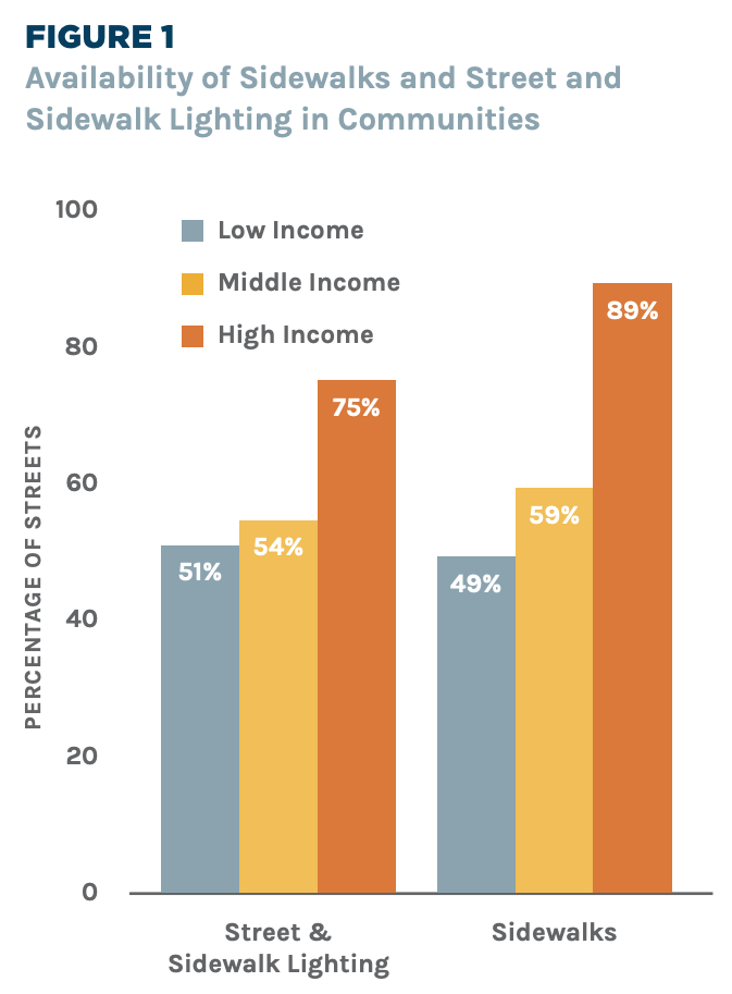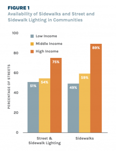 The impacts of dangerous streets are also felt more strongly within low & middle-income communities where streets have fewer design features that increase safety—like sidewalks, crosswalks, or street lights. By making streets safer and inviting for active transportation like walking and biking, Complete Streets policies can help improve people’s health.