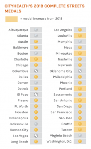 A new report from CityHealth finds that 90 percent of the nation’s 40 most populous cities have medal-worthy Complete Streets policies on the books. The report makes a case for building safer streets to improve the overall health of cities, especially in the era of COVID-19.