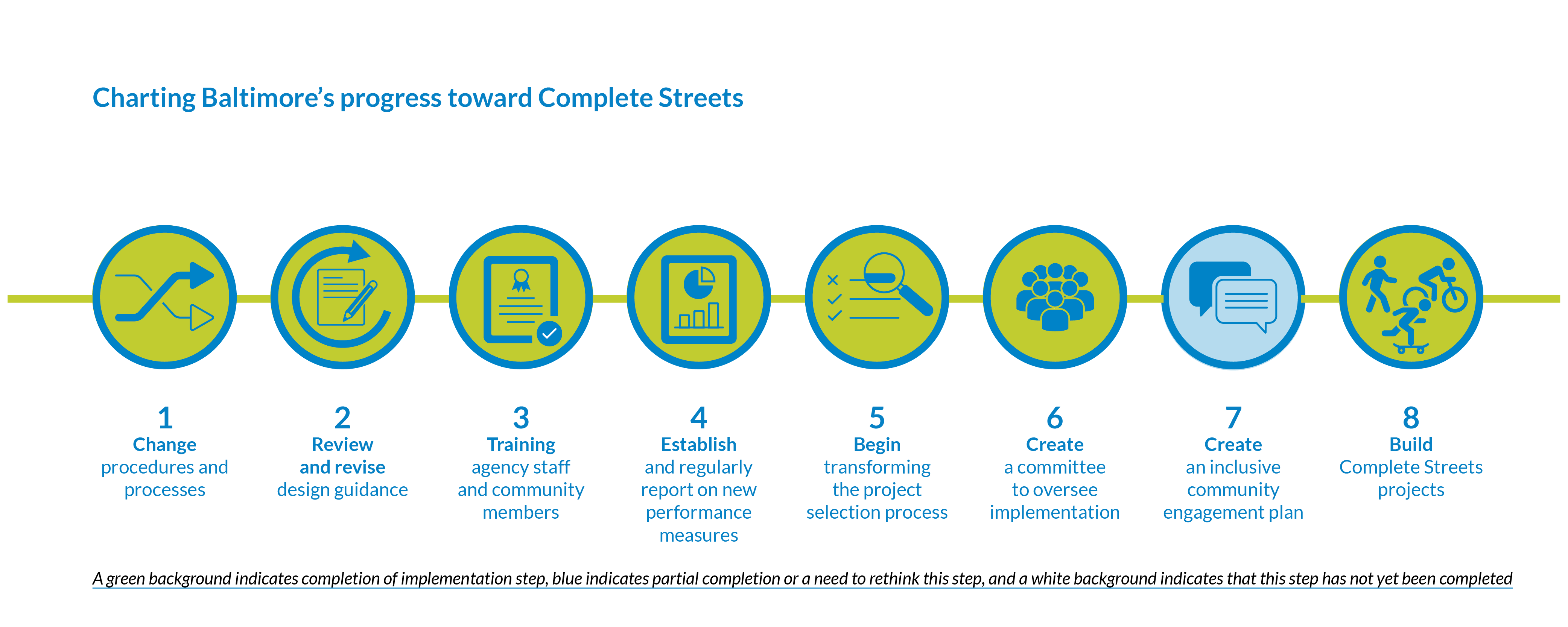 In 2018, Smart Growth America featured the City of Baltimore’s 2018 Complete Streets policy as one of the top 10 policies passed in the country in the Best Complete Streets Policies Report (2018). The updated policy received a strong score due to a variety of factors, including its stringent, binding requirements to improve community engagement, project delivery, and performance measures and reduce disparities in Complete Streets implementation overall. Since passing the policy in 2018, the city has wasted little time putting the policy into practice. As seen in the graphic below, the City of Baltimore picked up its momentum on all of the following implementation steps in the last couple of years. The Baltimore Complete Streets Manual, which was released in 2021, outlined and established crucial new processes for prioritizing, designing, and delivering Complete Streets projects on different types of streets.
