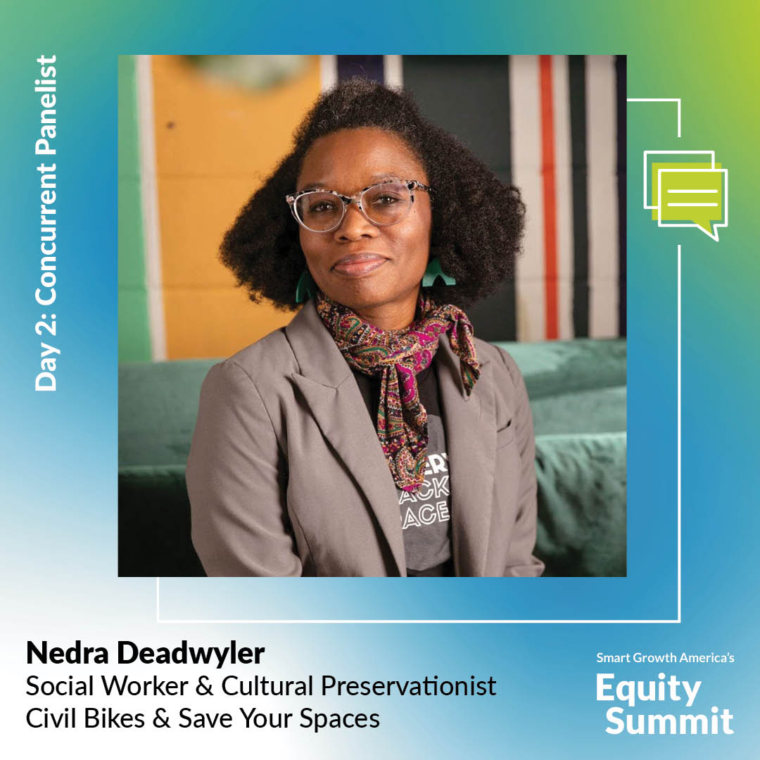Nedra Deadwyler guides equitable processes to bring community voices into defining and shaping places and the story of place. She is a social worker, cultural preservationist, and creative. She centers humanity, lived experiences, community care, and our beautiful world. Through her organization Civil Bikes she leads tours, provides bike education, advocacy for mobility justice, and youth bike camps. Through Save Your Spaces she facilitates skills sharing to involve the everyday person in preservation. She continues to write, think, and challenge the systems governing our quality of life and invites our collective transformation toward just interdependence.
