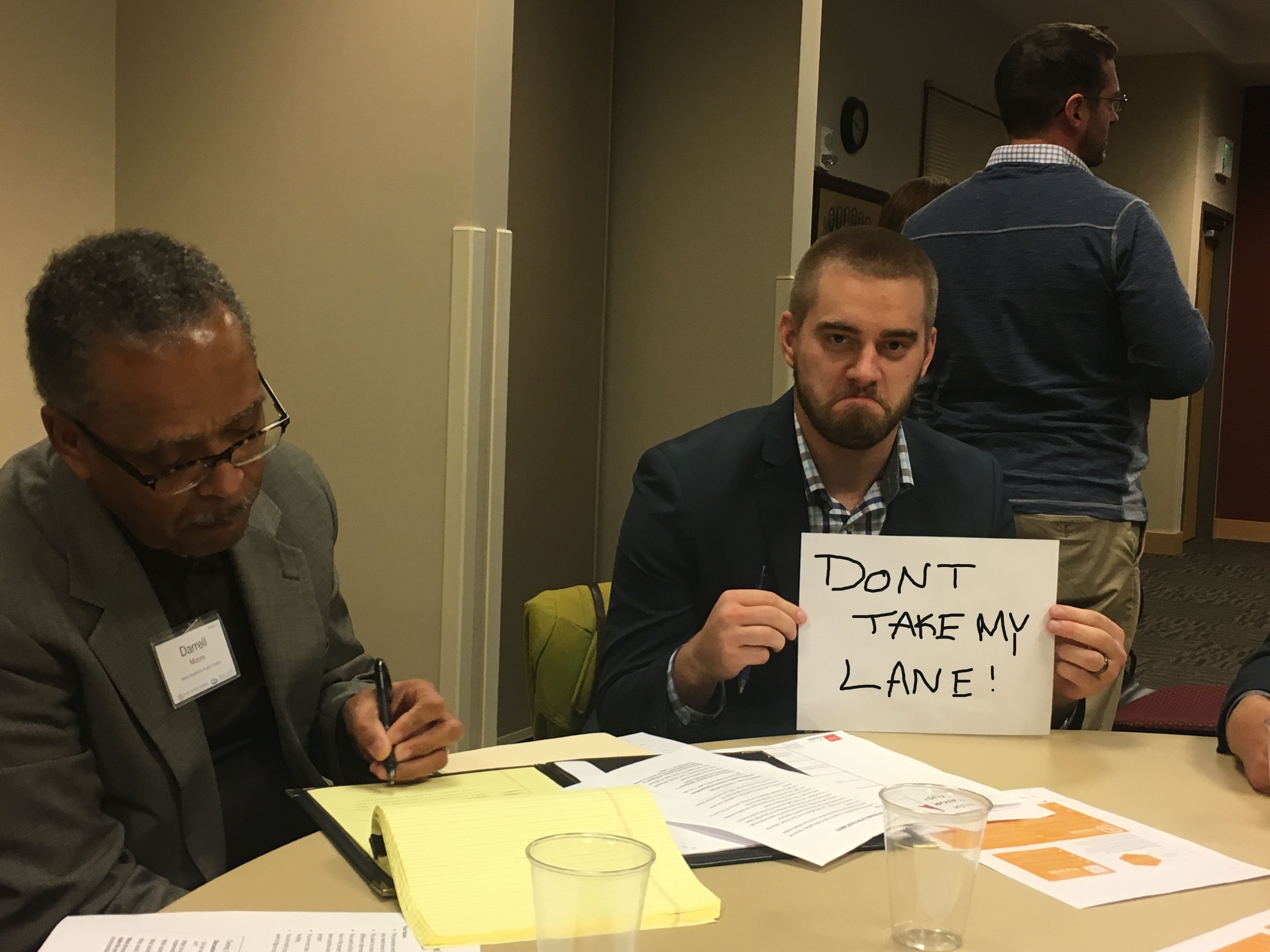 To bring all of these pieces together, we wrapped up day one with a role-playing exercise—a mock public hearing on a hypothetical Bus Rapid Transit (BRT) project. Our mock hearing touched on some very real questions being debated today in Nashville, where voters will decide in an upcoming ballot referendum this May whether to invest over $5 billion in regional transit expansion, including BRT and light rail. Everyone took on a new identity for the exercise. Some of us played planning and engineering staff from the city, suburb, or state. Others acted as advocates, transit agency staff, or business owners. We also had some very convincing portrayals of community members who ranged from transit-dependent and supportive of the project to entirely opposed to any changes. As you can see, we were very committed to our characters: