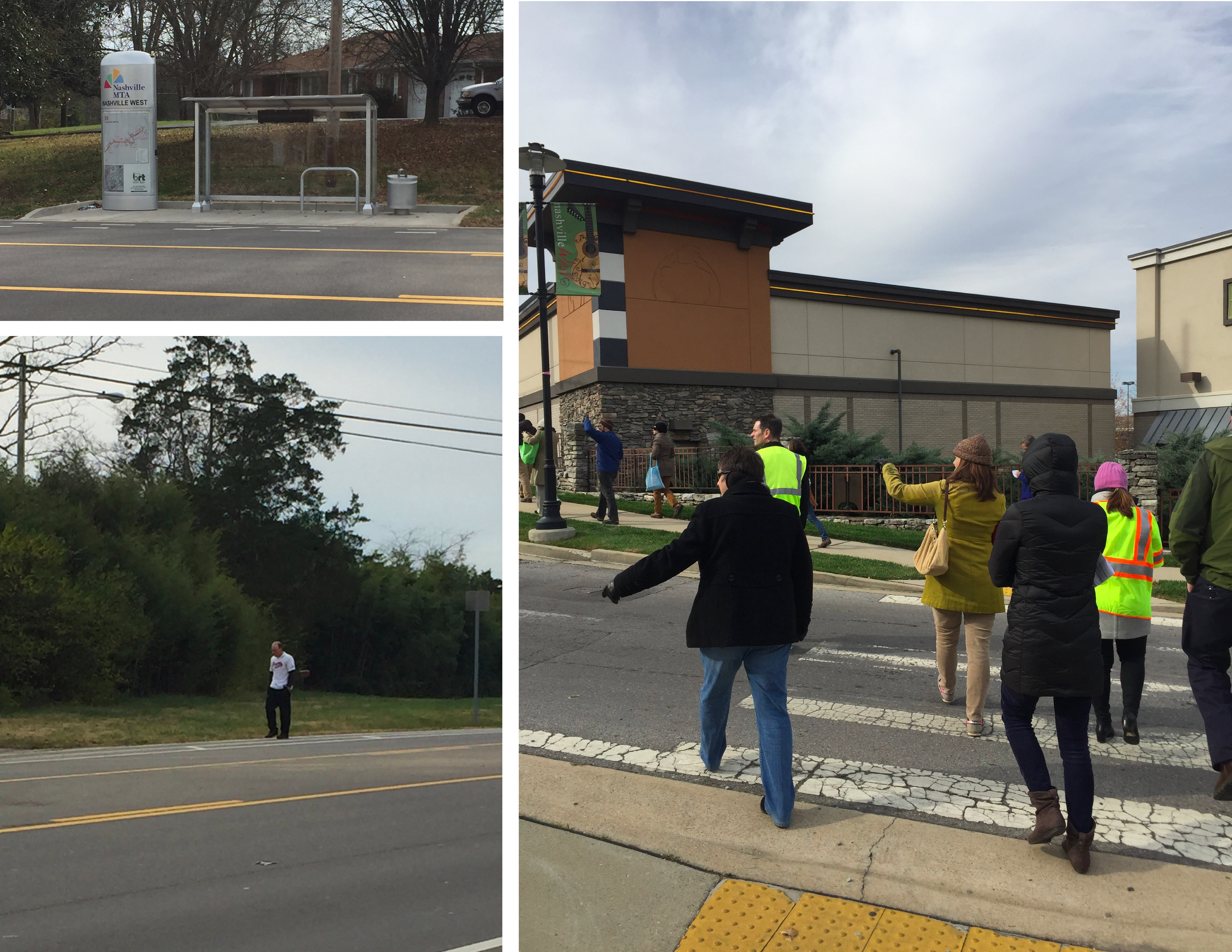 By the time we embarked on our suburban case study in day two, we had all gained a great appreciation for the wide range of competing priorities and perspectives that go into transportation projects, especially projects that cross city lines. We rode Nashville’s BRT-lite bus line out to Charlotte Pike, where we noticed lots of missing connections, especially for people walking—sidewalks and crosswalks were few and far between, even at bus stops and the entrances to shopping centers. This is a recurring problem in Nashville where nearly two-thirds of the city’s streets lack sidewalks. Although the city is working to address this issue, it still has a long way to go.