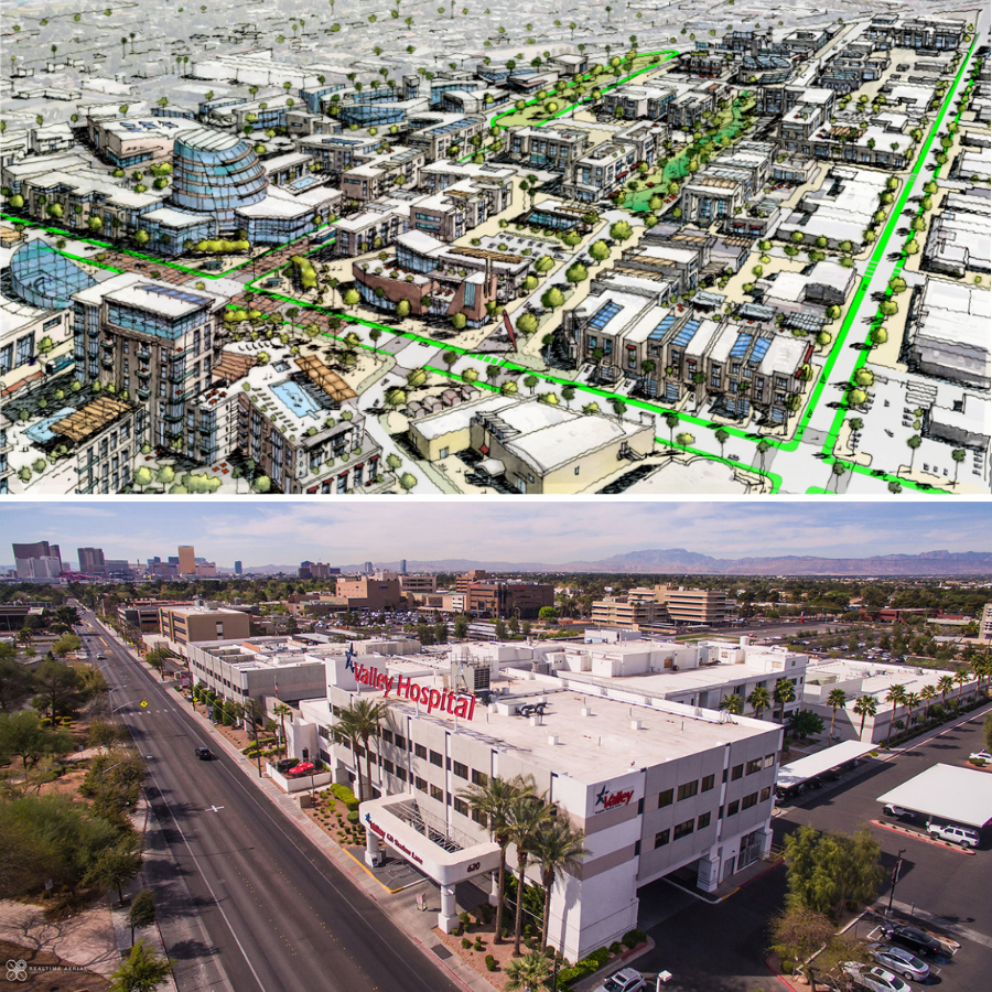 The Las Vegas Medical District Form-Based Code was officially adopted on October 19, 2018. It includes development standards and building types that fit in with the University of Nevada Las Vegas medical school, doctors’ offices, and two large hospitals. The code encourages walkable design, a variety of building types and development styles, and a diversity of uses all of which provide visual interest while preserving the district’s desired character.