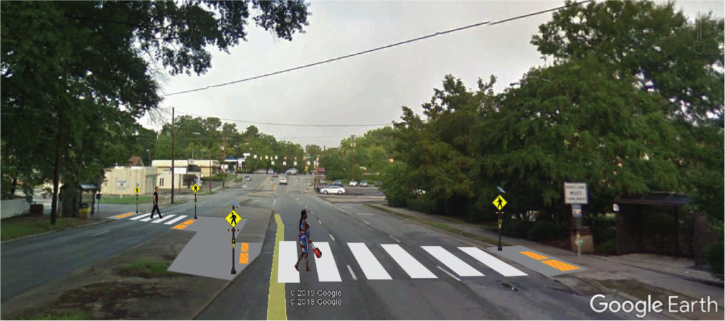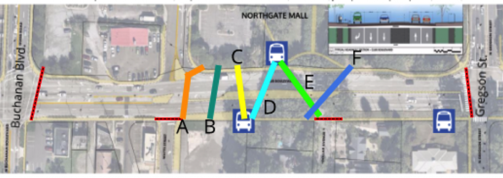 The most common crossing patterns observed at the site were D and C, where no crosswalk was present. Based on these observations, and based on feedback from the community, the Durham team developed a concept to install a new mid-block crosswalk with a protected pedestrian refuge.