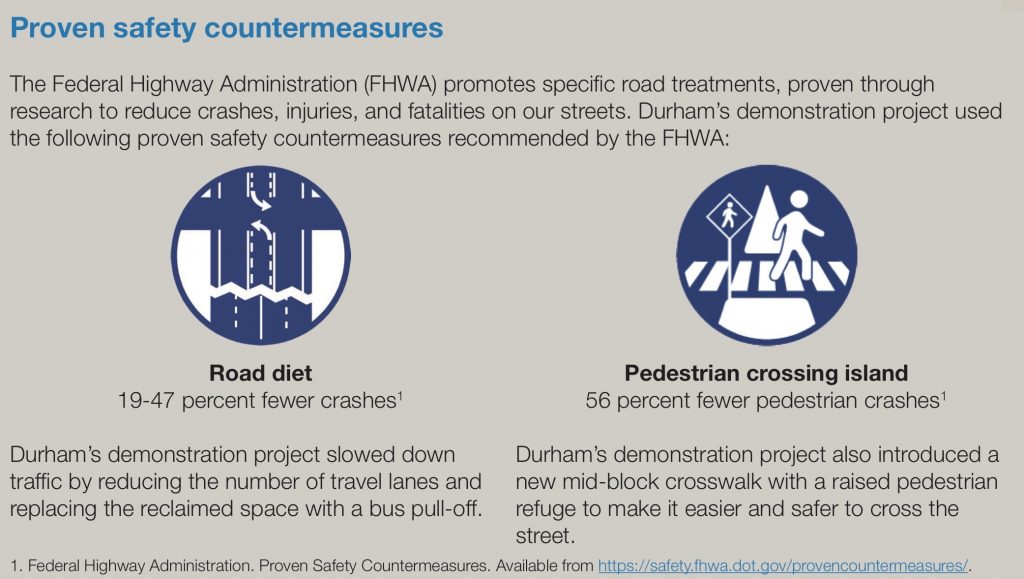 Based on Durham’s experience transforming West Club Boulevard, communities around the country can learn from the following lessons to launch their own safety demonstration projects: