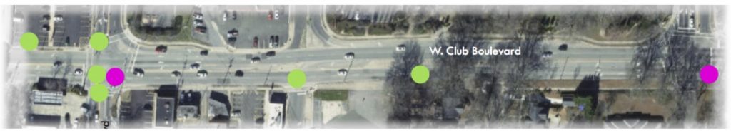 Between 2007 and 2015, eight crashes occurred on the segment of West Club Boulevard where the Durham team staged their demonstration project, including six crashes involving people waking (marked in green) an two involving people biking (marked in pink).