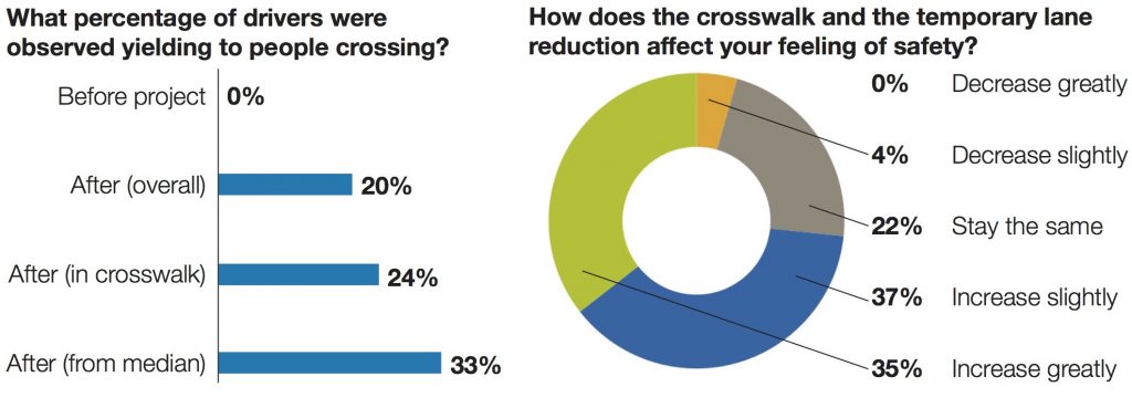 The results of Durham’s project speak for themselves. The team collected data before and after the project to measure changes in how people move through the space. Prior to their demonstration, zero percent of drivers yielded to people crossing the street between the bus stop and the shopping mall, but after they installed improvements this rose to 20 percent. Additionally, median driving speeds dropped from 30-33 miles per hour to 28-29 miles per hour. That may not sound like a lot, but a difference of five miles per hour can make a huge difference for safety, greatly reducing the likelihood of a crash and the severity of injuries should a crash occur. Furthermore, 73 percent of people who participated in intercept surveys following the installation reported feeling an increased sense of safety thanks to the changes.