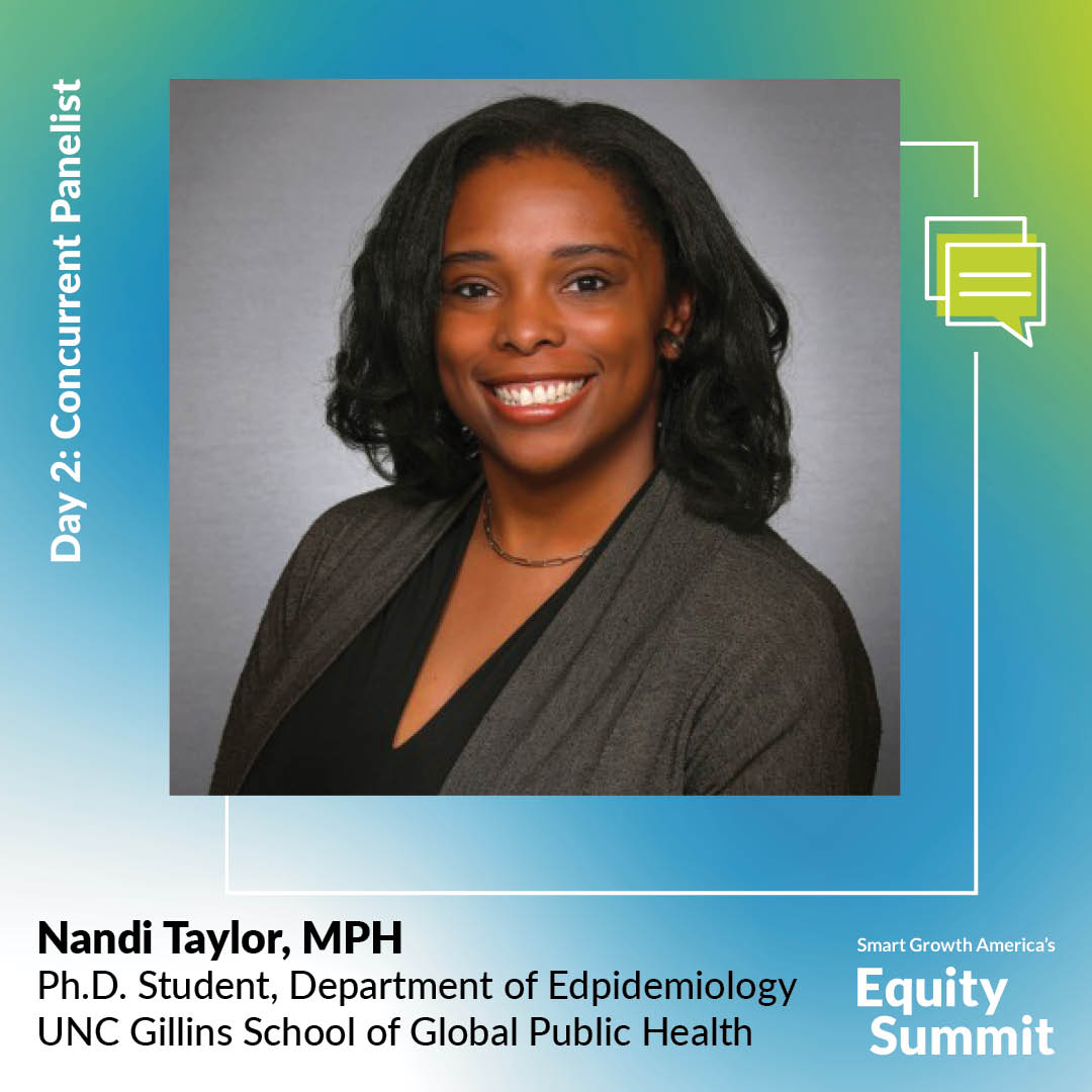 Nandi Taylor, MPH, is a Ph.D. student in the Department of Epidemiology at the UNC Gillings School of Global Public Health. Her dissertation research explores the relationship between structural racism and disparities in transportation safety outcomes. Her work with HSRC includes analyzing linked North Carolina crash and trauma registry data for the purpose of characterizing the limitations of the KABCO Injury Classification Scale to accurately measure injury severity, among other projects related to the intersection of public health and transportation safety.