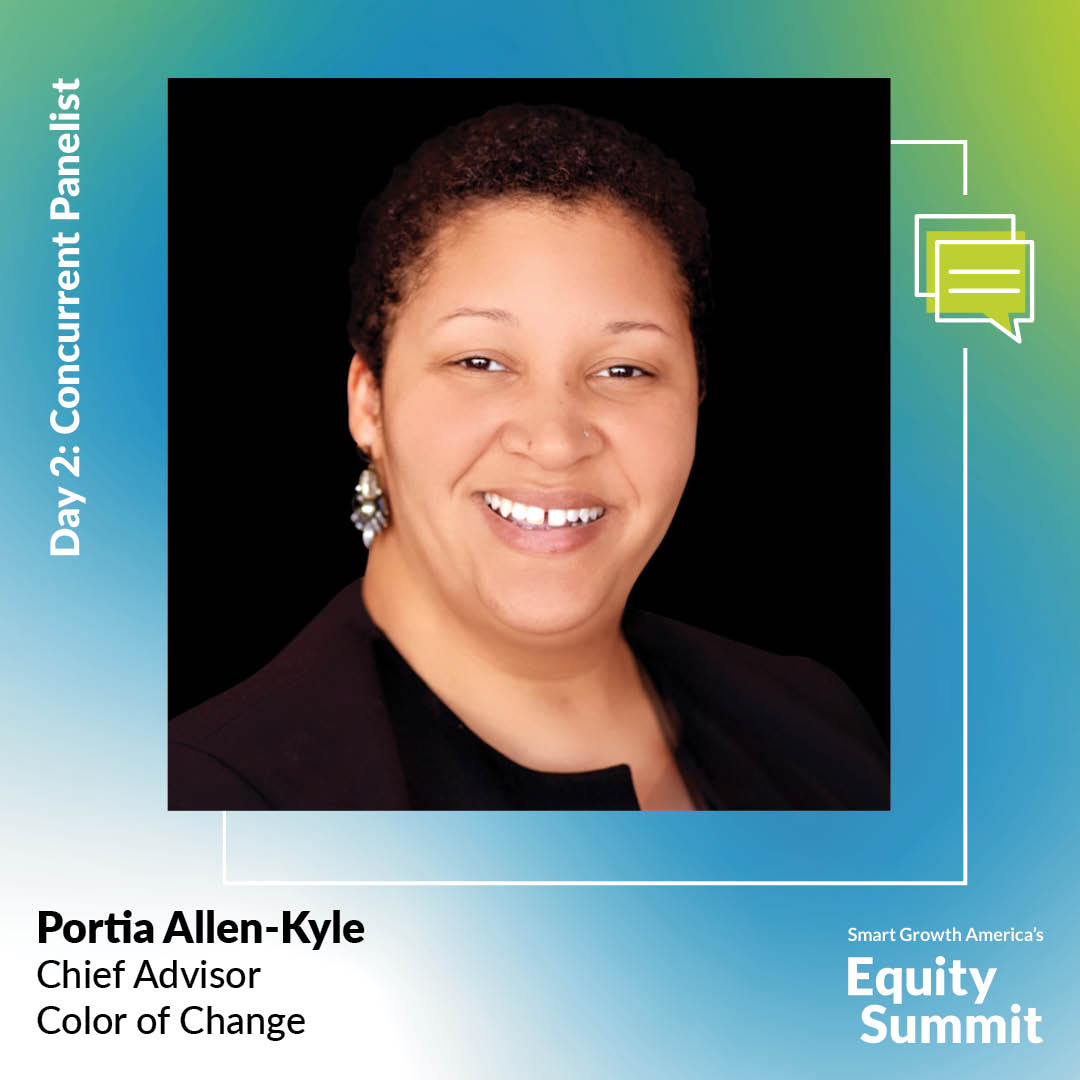 Portia Allen-Kyle is the Chief Advisor at Color Of Change where she is a thought partner to the president, working to advance Color Of Change’s vision, impact, and efficiency. Portia is a trusted advisor with a track record of advancing equity in nonprofit, government, and academic settings. Portia comes to Color Of Change with impressive experience as Senior Advisor for Equity, Policy, and Stakeholder Engagement in the Office of Civil Rights at the U.S. Department of Transportation. There, she advised leaders on how to incorporate equity into agency policy and led the Justice40 initiative, electrifying transportation, instituting diversity equity and inclusion practices, and spearheading funding pools to move towards more inclusive decision-making. She also helped oversee funding for Title VI recipients and managed agency events and outreach with the relaunch of the federal Advisory Committee on Transportation Equity.