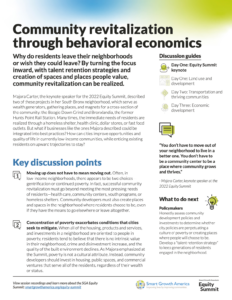 Consider how to improve your smart growth advocacy where you live or work. You can certainly do this on your own, but to maximize the impact, we recommend doing this with a small group of colleagues, friends, or other people in your community. Think of it like a book discussion group. Listen to this year’s Summit content, read the summaries of each session, and then think about the discussion questions together as a group—perhaps over a few weeks. For those of you that are ready to take the next step, you can put together a plan of action.
