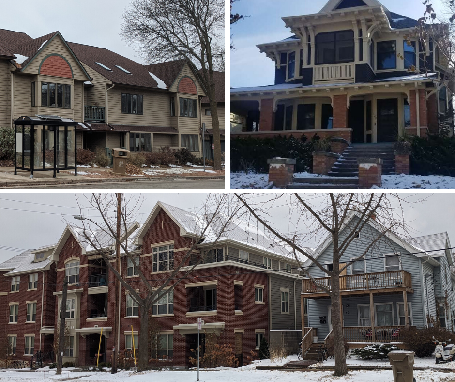 Sound idyllic and impossible today? It shouldn’t be. My current neighborhood in Madison, WI—a medium-sized, growing, thriving city—feels similar to my childhood hometown with an array of housing choices. On my block there are a couple of duplexes, a three flat (aka triplex), and one brick building with six apartments mixed with single-detached homes of various sizes. Mine is a very small one (pictured up top), not much bigger than a two-bedroom apartment, but with a basement, attic, front porch, and back yard. I’m living there by myself, so I don’t need or want more than that. The next block over there are some larger apartment buildings, and within a short walk I can reach a couple of condo buildings and big, old historic homes. There are residential options for students, empty nesters, and yes, families.