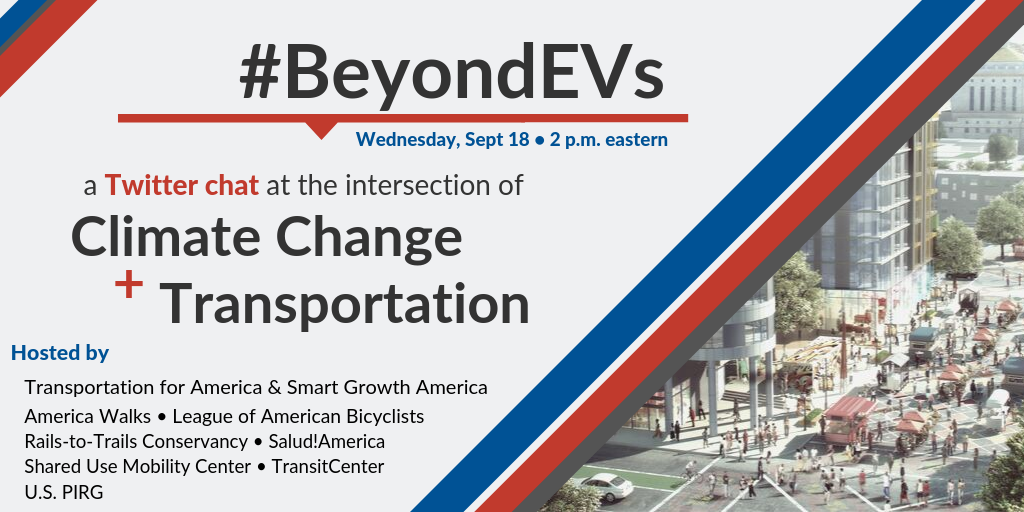 Join us for a Twitter chat about transportation & climate change on Wednesday, September 18 at 2 p.m. ET/11 a.m. PT. @T4America and our cohosts will lead the conversation with a series of questions over the course of an hour. Use #BeyondEVs to tweet you answers.