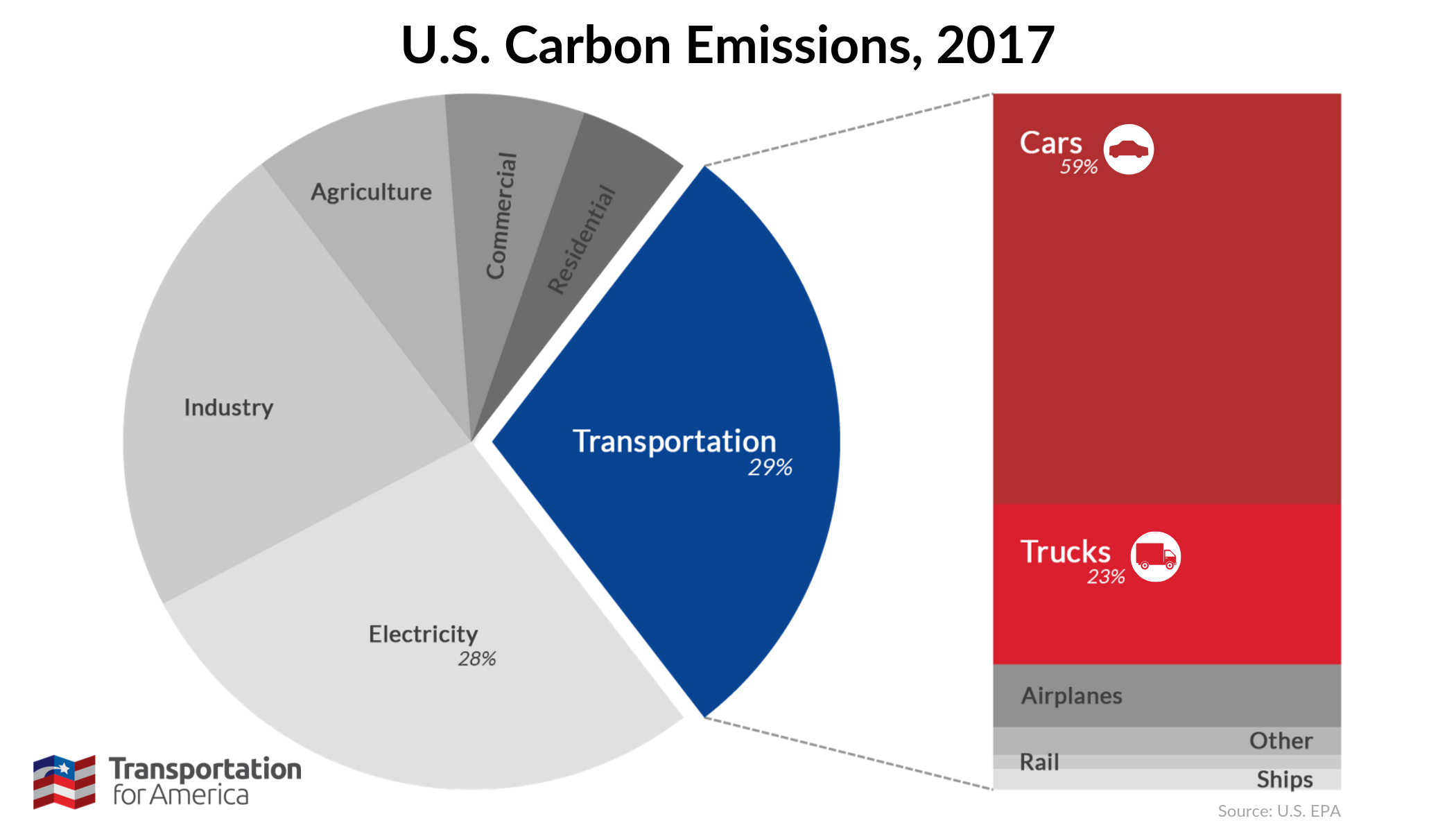 Transportation accounts for the largest share of carbon emissions in the U.S., and those emissions are rising—even as other sectors have improved. As federal policy and funding encourages more and wider highways, people live further away from the things they need and the places they go. We’re driving further and further every year just to get where we need to go. Emissions have risen despite increases in fuel efficiency standards and the adoption of electric vehicles. Despite an admirable 35 percent increase in the overall fuel efficiency of our vehicle fleet from 1990-2016, emissions still rose by 21 percent. Why was that? Because the total amount of miles traveled increased by 50 percent in that same period.
