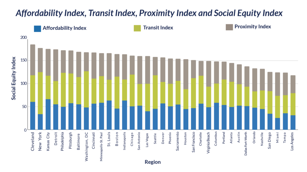 The Index reveals areas that are affordable with a comparatively smaller amount of walkable urbanism (i.e. ranked lower on our Foot Traffic Ahead Index) ranked higher in social equity. This included places like Cleveland, Kansas City, Detroit, Pittsburgh, and Baltimore. These cities’ scores were bolstered by higher rankings on the Proximity Index, meaning that the limited walkability that does exist there is not as segregated between socioeconomic and racial groups. Other regions which are more connected by transit and contain higher amounts of walkable urban development but are more expensive, like New York City or Philadelphia, also rank highly on our Social Equity Index with their high scores on the Transit Index giving them a boost. Those regions that are both unaffordable and not well connected or walkable, like Los Angeles and Miami, rank towards the bottom of our Social Equity Index.