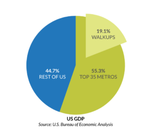 The report found that 19.1% of the total U.S. real GDP and 6.8% of the U.S. population are located in walkable urban places that represent just 1.2% of total landmass of the top 35 U.S. metros.