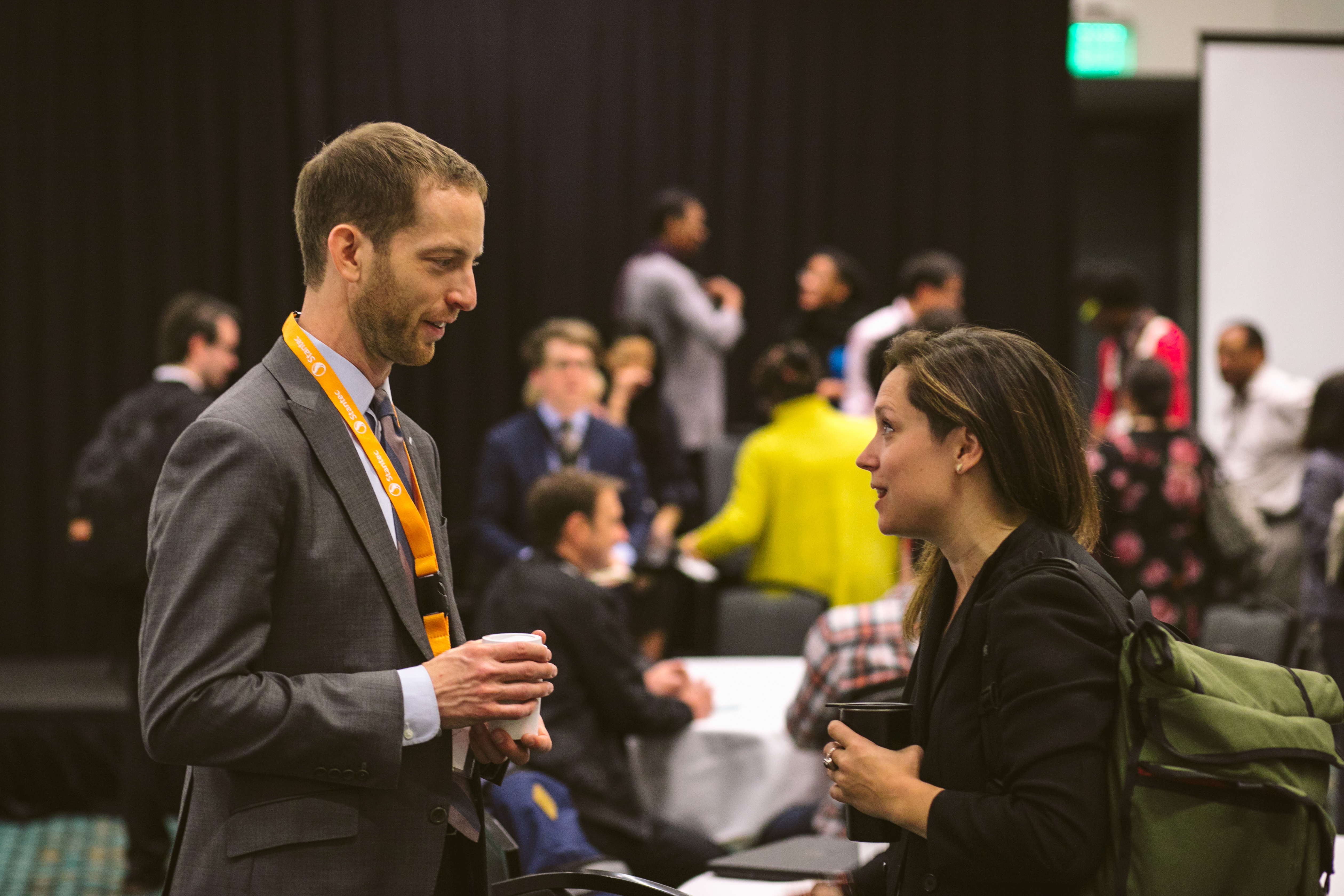 Attendees at the Intersections mingle during a reception following the first day of the conference.