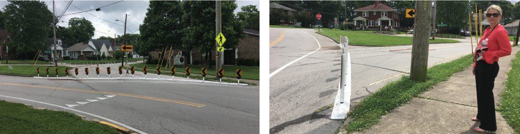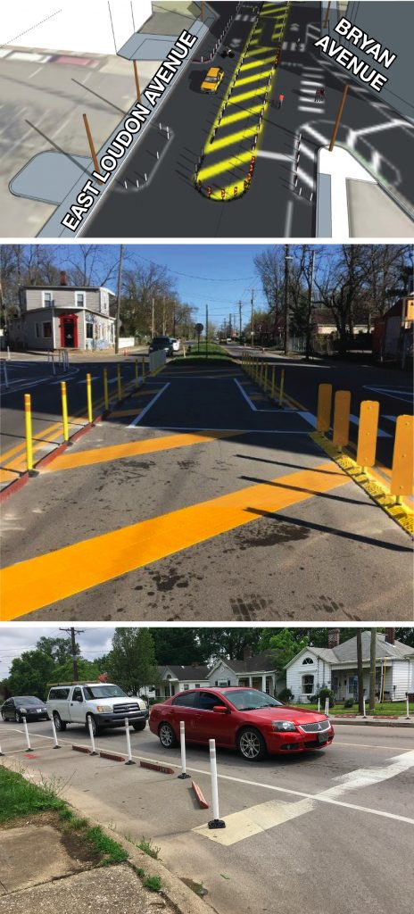 Lexington’s redesign of Bryan and East Loudon Avenues included bump outs and a protected mid-block crossing using temporary vertical posts.