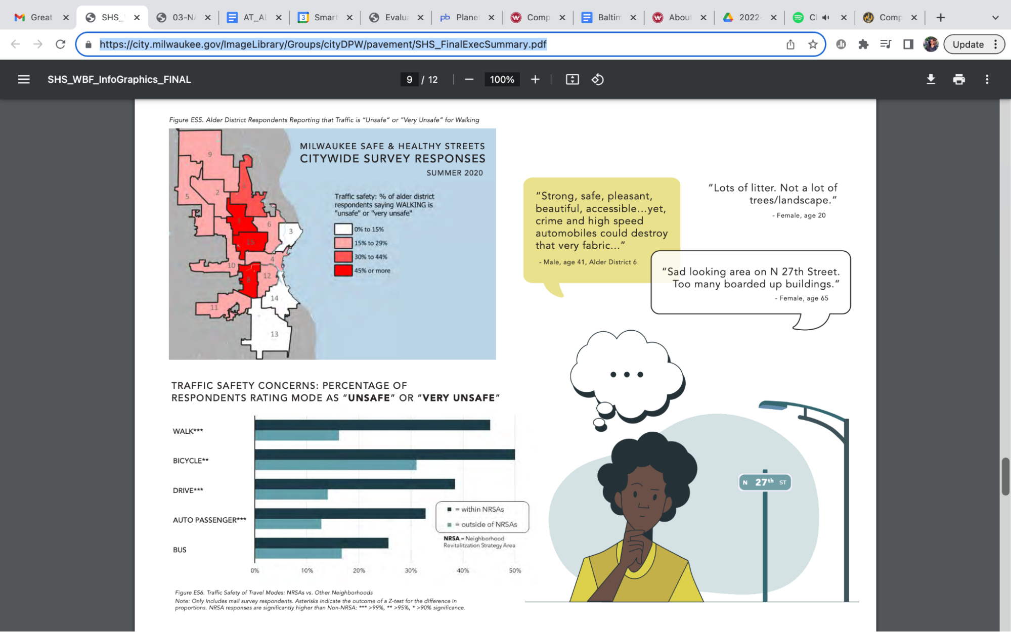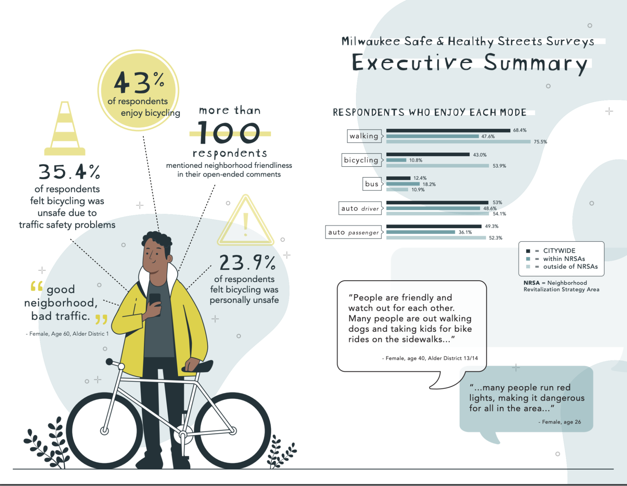 These reports are a great example of showing the status of Complete Streets work and impact in the community over the years—and their perception surveys are particularly worth applauding. Most cities shy away from collecting qualitative data but Milwaukee not only collected the data through postcards and online surveys to understand safety, fear, and comfort of using different modes, but created easy-to-understand graphics from the results. The results show a distinct difference in perceptions of community members using different modes within the NRSAs and outside of those neighborhoods, highlighting the need to invest in these neighborhoods more proactively. (Element #2 of a strong policy).