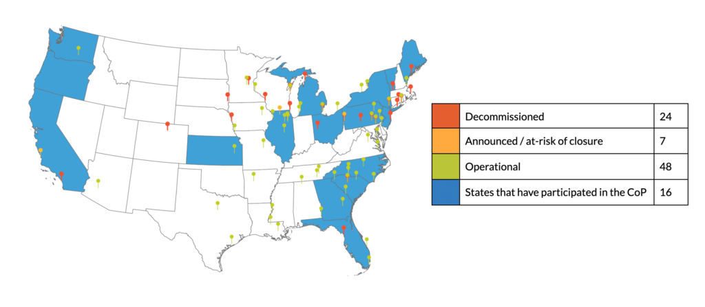 Phase One of the CoP included three sessions which organized participants by their community’s plant status (closed, announced decommissioning, or operating, as depicted above). Each session had a flexible structure to encourage open dialogue but also included a brief educational /resource presentation to help facilitate discussion. Those who attended were eager to participate, learn from others, and get a better understanding of other people’s situations.