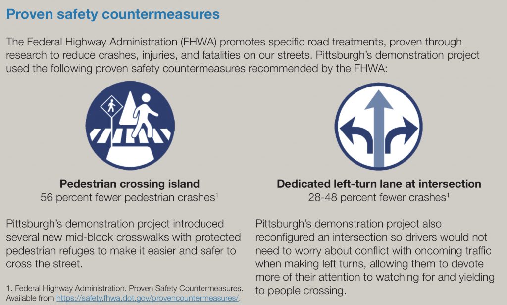 Pittsburgh’s demonstration project made it safer and easier to cross the streets surrounding an elementary school by reconfiguring a dangerous intersection and introducing protected pedestrian refuges at crosswalks.