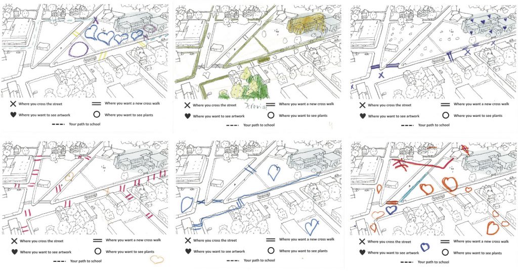 Students from nearby Lincoln Elementary School drew on maps to tell the Pittsburgh team how they get to school currently and where they would like to see new and improved crosswalks.