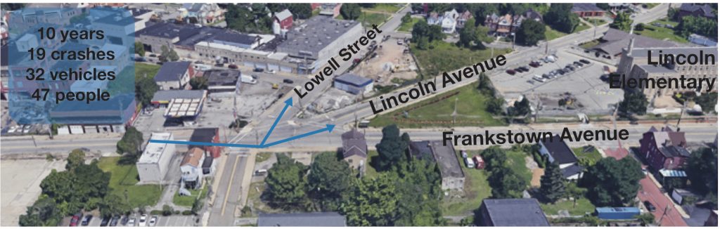 Most of the crashes at this intersection involved cars making quick left-hand turns from Frankstown Avenue onto either Lincoln Avenue or Lowell Street. This put children who cross this intersection to reach nearby Lincoln Elementary School at risk of being struck and injured or killed.