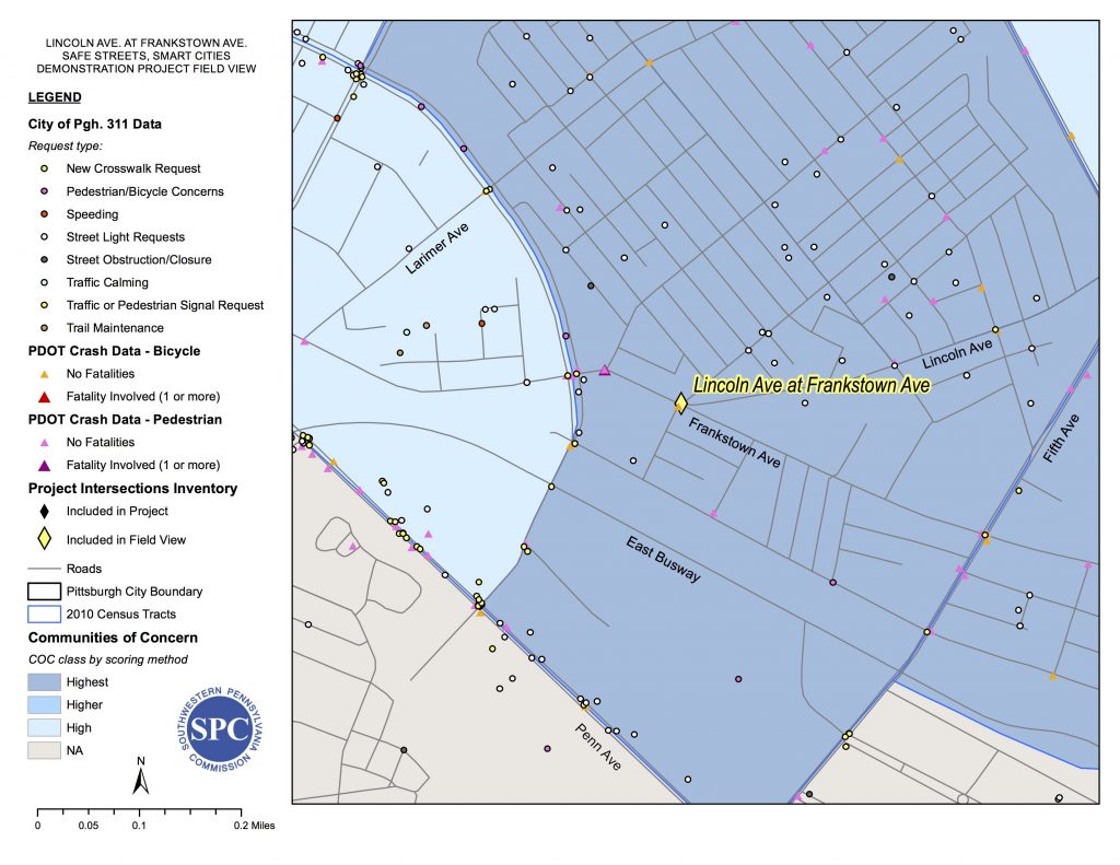 To choose the site of their demonstration project, the Pittsburgh team looked at the overlap between crashes, communities of concern, and gaps in 311 requests.