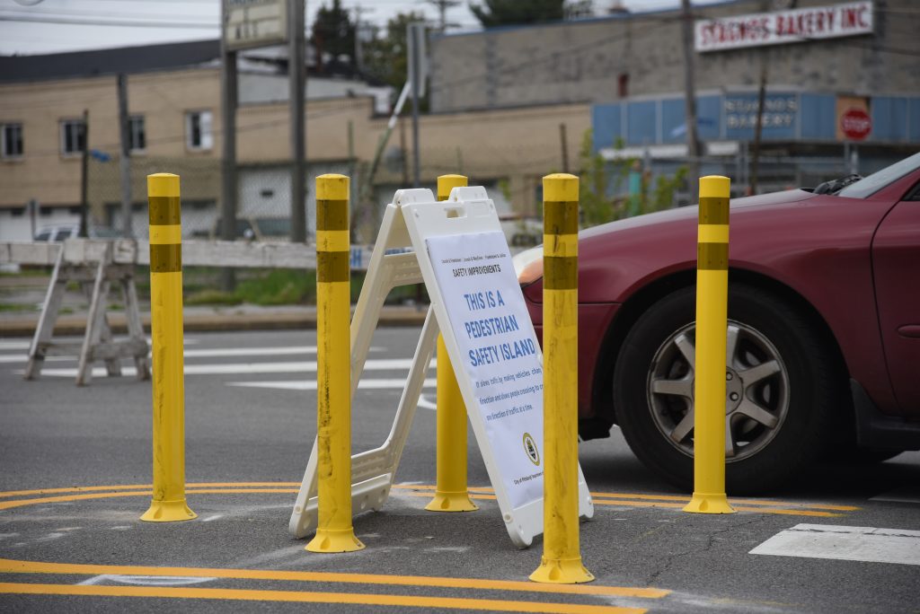 Using paint and temporary dividers, the Pittsburgh team created pedestrian refuge islands so people crossing the street would only need to worry about one direction of traffic at a time. This also narrowed the roadway approaching crossswalks, cuing drivers to slow down, pay attention, and yield to people crossing.