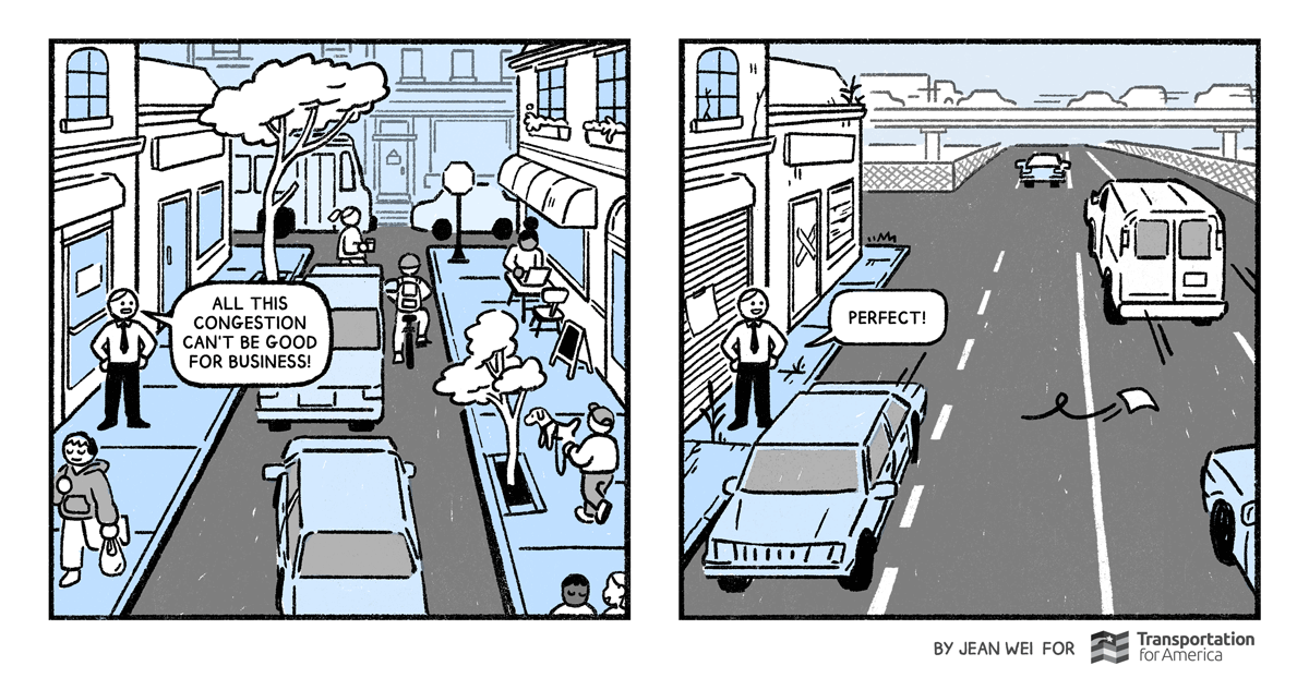 These slippery economics that place a tangible dollar value on every second of time savings allow transportation agencies to claim increased speeds from improved level of service as an unqualified economic benefit, even though a person saving two or three minutes in a year doesn’t receive any actual, tangible money back in their pocket. Increasing speeds on a local main street or commercial area can also harm local businesses, especially small businesses that more heavily rely on customers walking and biking—impacts which are not measured or considered.