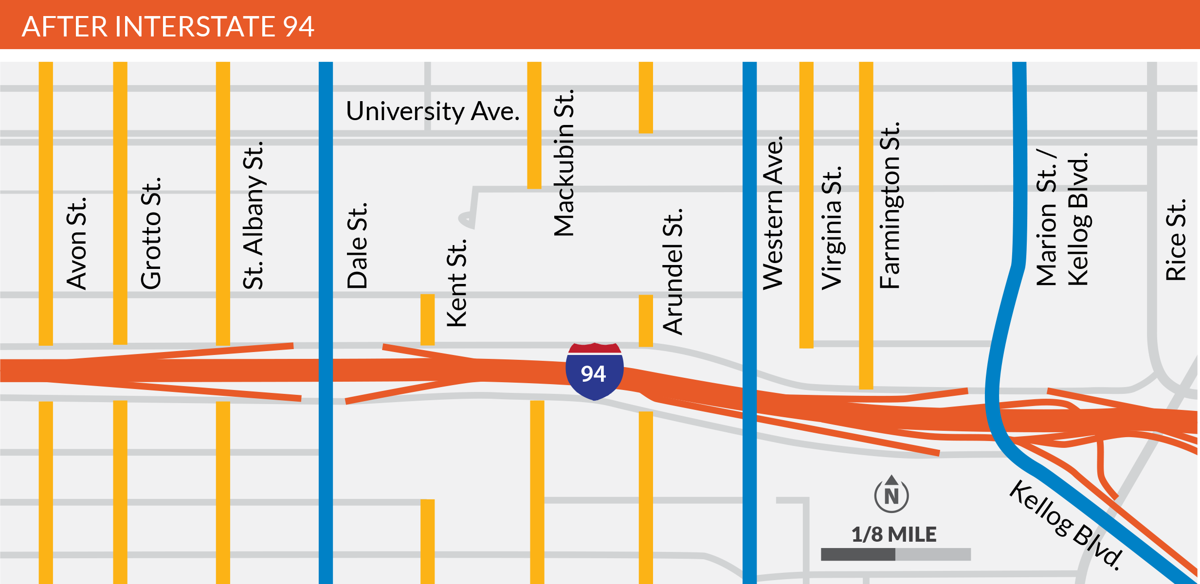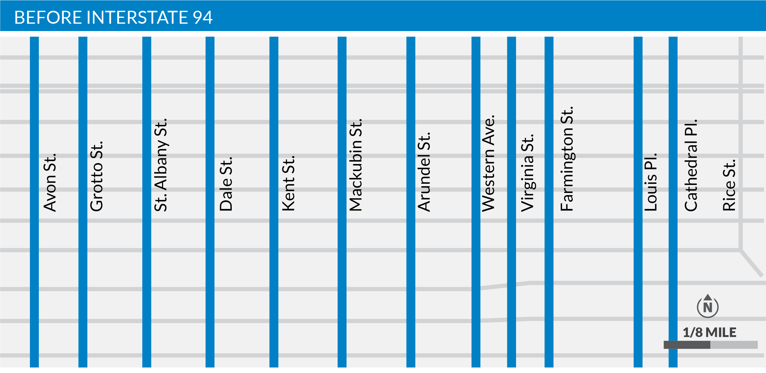 Left: The interconnected 1950’s street grid west of downtown St. Paul, MN provided people in these neighborhoods with many convenient potential routes and options—walking, driving, transit—for all of their trips. Right: In the 1960s I-94 severed at least eight of those north-south routes, making all other trips longer.
