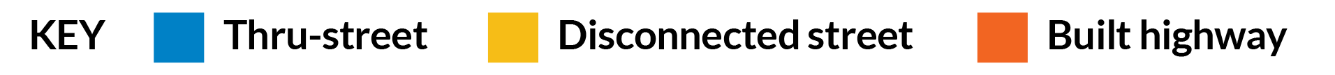In similar projects today, when attempting to measure time savings, agencies only measure vehicle speeds in the orange highway corridor. The disruptive impacts to the people who live on either side of the new road, and the trips they take, are literally not considered at all.