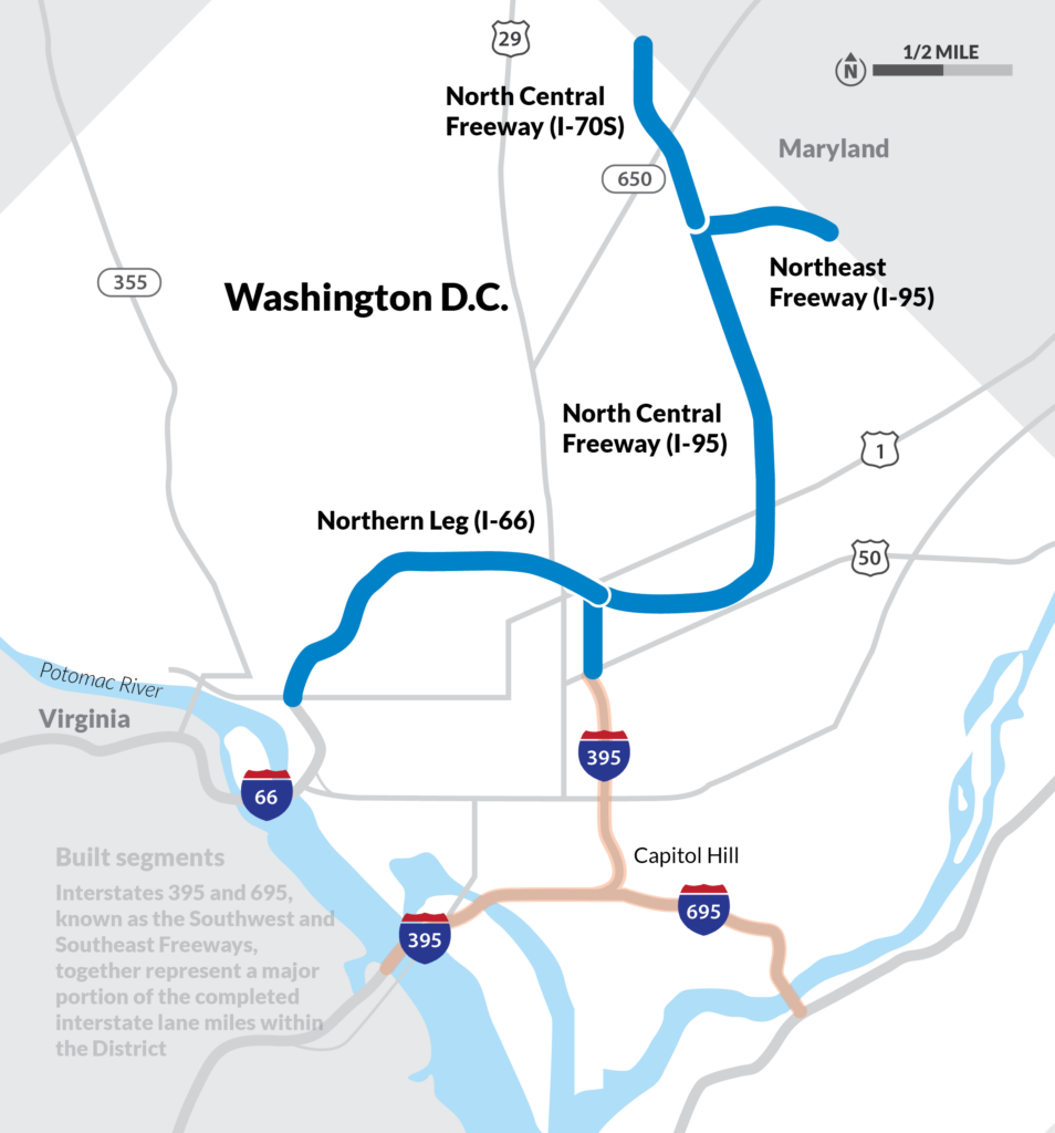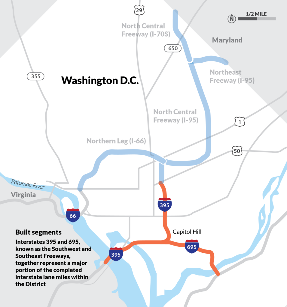 Interstates 395 and 695, known locally as the Southwest and Southeast Freeways, together represent a major portion of the completed interstate lane miles within the District.2 395 carries traffic across a set of massive bridges from Virginia into the District and then (on 695) across the Anacostia River to Interstate 295 (and DC Highway 295). A short segment of 395 splits off and continues north under the National Mall, terminating at New York Avenue/4th Street NW. As originally conceived, it would have connected to both the North Central Freeway and the Northern Leg freeway—both analyzed here.