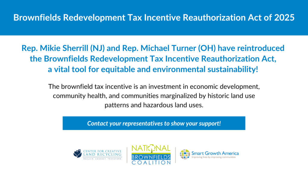 The National Brownfields Coalition is thrilled to announce the 2025 reintroduction of the Brownfields Redevelopment Tax Incentive by Representatives Mikie Sherrill (NJ-11) and Mike Turner (OH-10). This bipartisan effort, known as H.R. 815, seeks to restore a critical tax deduction that will spur redevelopment, create jobs, and enhance the well-being of communities across the country.