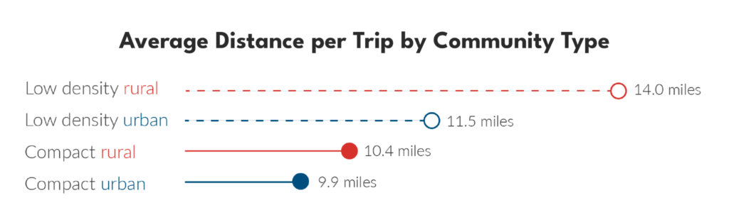 Small and rural towns have great potential for creating viable networks that serve residents and visitors. In many rural communities, residents live long distances from services, but most small towns provide a compact center well-suited for walking and bicycling trips. Households closer to development in both rural and urban areas have much shorter daily trips than households located further from concentrated development (see Figure 3).