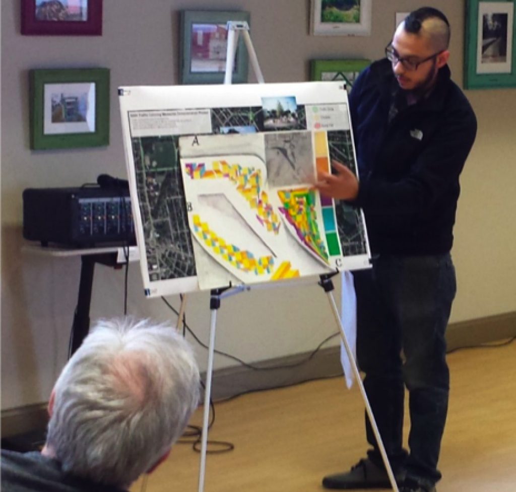 A local artist designed street art to paint on the pavement as part of South Bend’s demonstration project and presented his concept to the community.