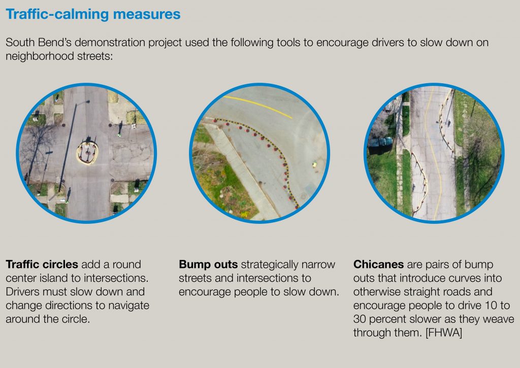 To address recurring, dangerous speeding problems on neighborhood streets, the City of South Bend launched a demonstration project to test out traffic-calming tools they had never used before including traffic circles, chicanes, and bump outs. They worked closely with the local community to decide where these traffic-calming strategies were most needed. They also added educational signs to help teach people how street design can improve safety by encouraging drivers to slow down while simultaneously creating more vibrant places for people. As a result of this demonstration project, drivers drove slower on these streets, and South Bend also built trust with the community. To replicate the success of this project elsewhere, South Bend will develop a toolkit based on this experience to launch additional traffic calming projects in other neighborhoods throughout the city to improve safety and convenience for people on foot or bike.