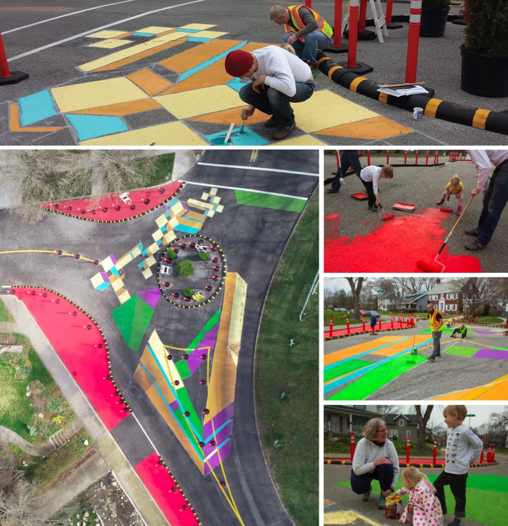 The largest installation in South Bend’s demonstration project was a traffic circle at the intersection of Riverside and Hudson Avenues. This intersection is often used as a cut-through to downtown, with drivers speeding through the wide, unusually angled intersection at over 30 miles per hour or more, even though the speed limit is 20 miles per hour. To encourage drivers to slow down and watch out for people walking, the team used rubber curbing and vertical posts to transform the intersection into a traffic circle. They also invited the fire department and first aid squad to come test out the circle first to ensure fire trucks and ambulances could fit through before securing the curbing in place. Then, to make the project more exciting and memorable, they invited local families and elected officials to help paint colorful patterns on the pavement. This traffic circle was designed to remain in place for 90 days with the option of installing more permanent safety improvements with support from the community and elected officials.