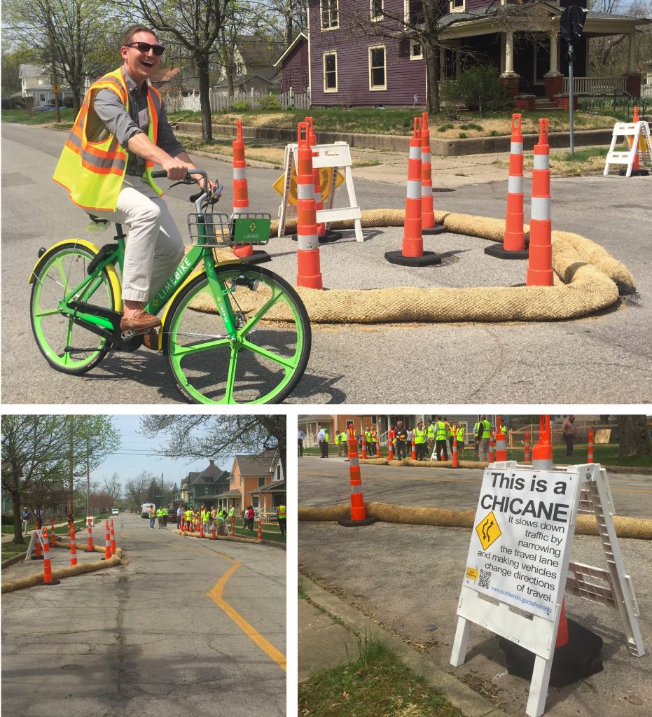 Based on community feedback, the South Bend team decided to test out three different traffic-calming measures in five locations throughout the neighborhood. They installed two traffic circles, two chicanes, and one bump out all within the same neighborhood to give people a sense of the variety of tools at the city’s disposal to make local streets slower and safer.