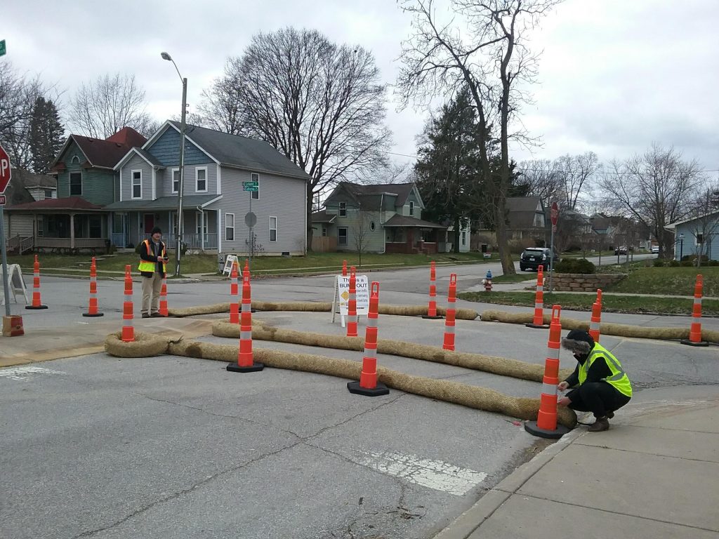Using temporary materials like cones and straw logs made it easy for the South Bend team to make adjustments to their project as needed. For example, local residents observed that larger vehicles like school buses had difficulty navigating the smaller traffic circle and making turns at the new bump out, so the team was able to quickly respond to this feedback and reshape these intersections accordingly. Neighbors also noticed that people were driving down the middle of the road instead of properly weaving through the new chicanes. As South Bend considers converting the chicanes into permanent improvements or introducing them in other neighborhoods, they’ll know to bring the chicanes closer to the center lines of the road or add a physical barrier down the middle.