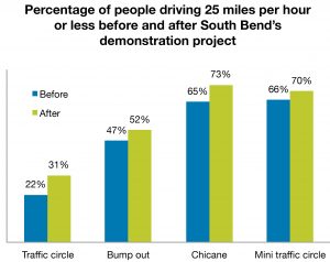 Thanks to South Bend’s safety improvements, traffic slowed down measurably. The share of people driving 25 miles per hour or less increased at all five installations, especially at the main traffic circle. Before the project, only one out of every five people drove 25 miles per hour or less at this intersection, but once the team installed their traffic circle, one out of every three drivers drove this slowly. As a result of these projects, South Bend generated support from the community and from elected officials for future traffic calming projects and other safety improvements. The team will use this experience to develop a traffic calming toolkit to be used with other communities throughout the city to make neighborhood streets slower and safer for people.