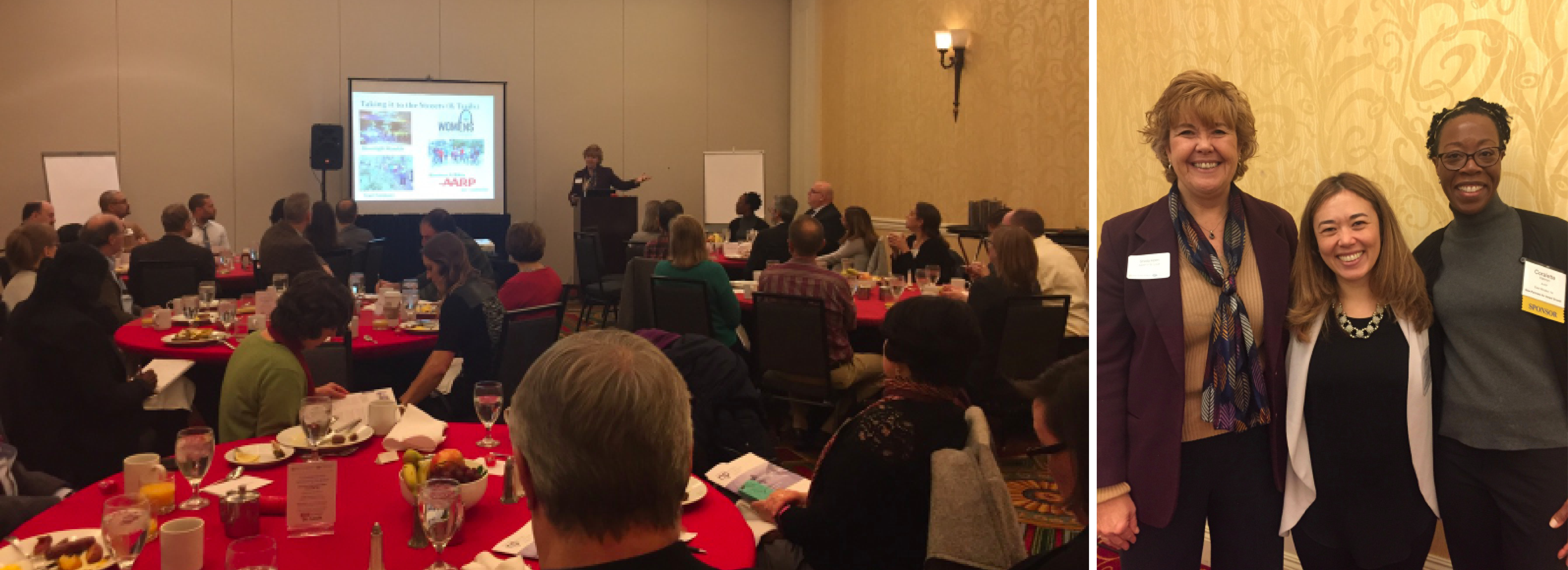 Left: Sheila Holm (AARP Missouri) presenting at the Complete Streets Networking Breakfast in St. Louis. Right: Sheila Holm, Emiko Atherton (NCSC), and Coralette Hannon (AARP) gather for a photo.