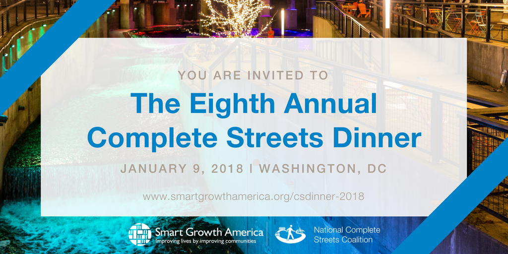 You’re invited to join the National Complete Streets Coalition at our Eighth Annual Complete Streets Dinner, held on Tuesday, January 9, 2018 in Washington, DC. Conveniently scheduled during the 2018 Transportation Research Board meeting, this intimate and fun event brings together top Complete Streets professionals, policymakers, supporters, and friends to celebrate the successes of the Complete Streets movement in the last year.
